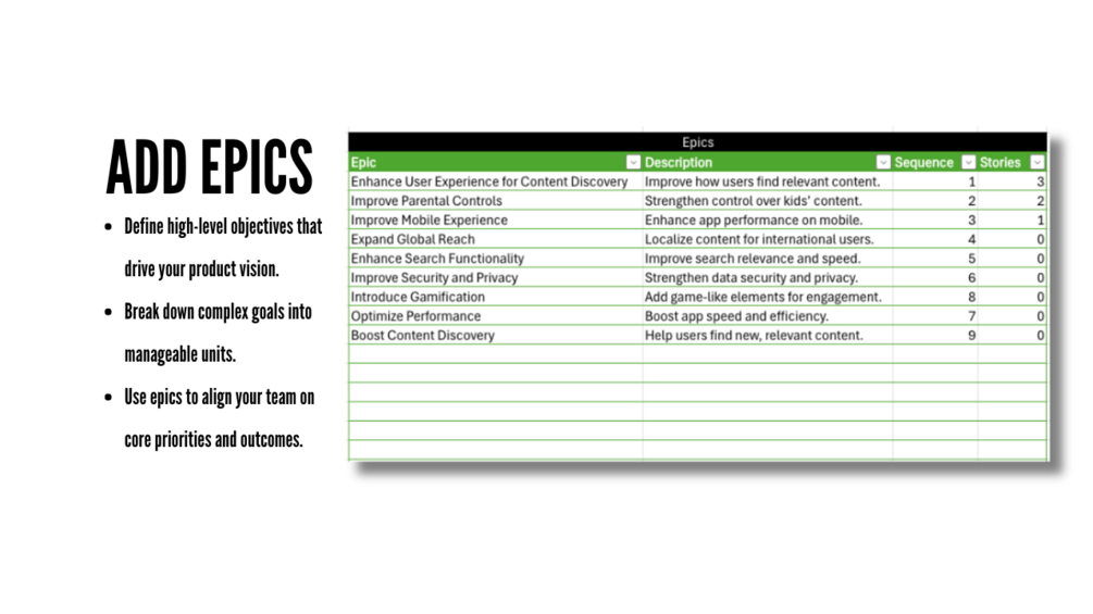 You will get a customizable Excel template with built-in tools for creating epics, features, stories, and personas, including prioritization and progress tracking—perfect for fast and efficient product planning.